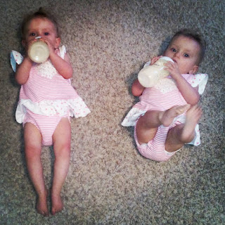 They also like drinking their bottles together, and will hold them on their own now. They could hold their bottles when they were 8 months old, but would only do it when they felt like it.